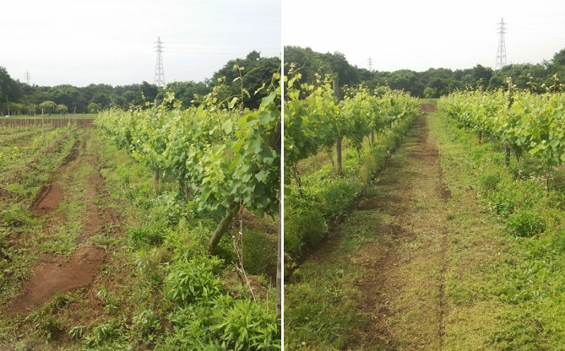 さて、ブドウ畑ですが、第2農場プティマンサンの成長はご覧のように著しく、今週末には芽かき、整枝、剪定の作業を同時に行う予定です。病気や虫による影響もなく順調な生育と思います。一番上の番線を超えて伸びている枝はそれ以上栄養を与えなないため、ブドウの実に栄養を集中するために摘心します。作業が終わってきれいになったらご報告いたします。