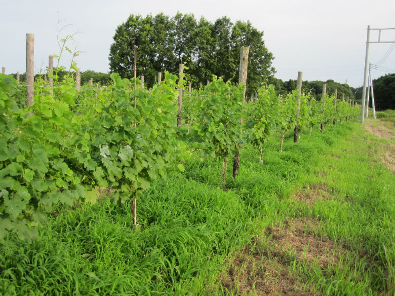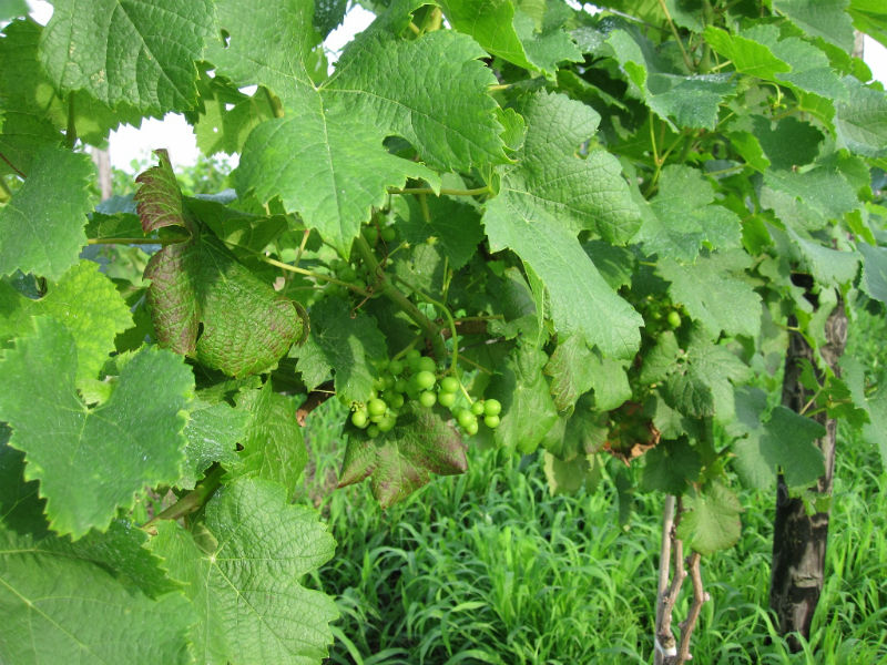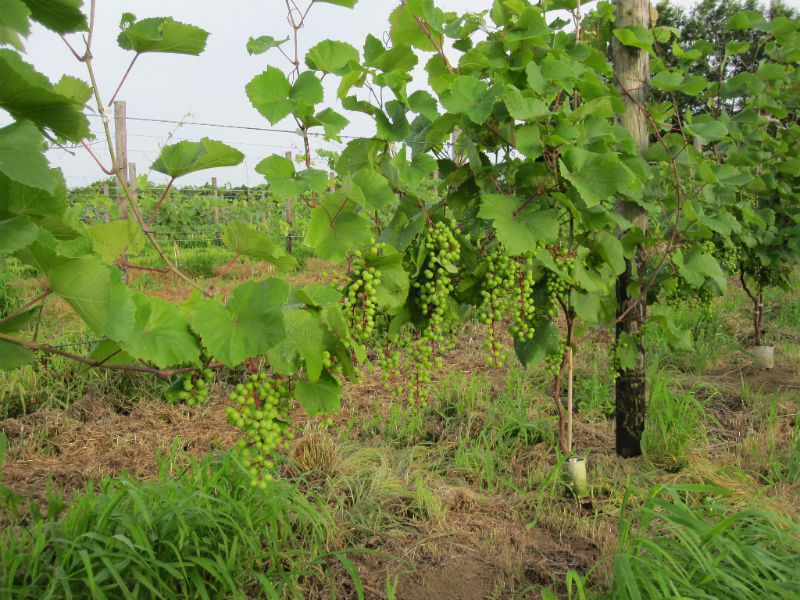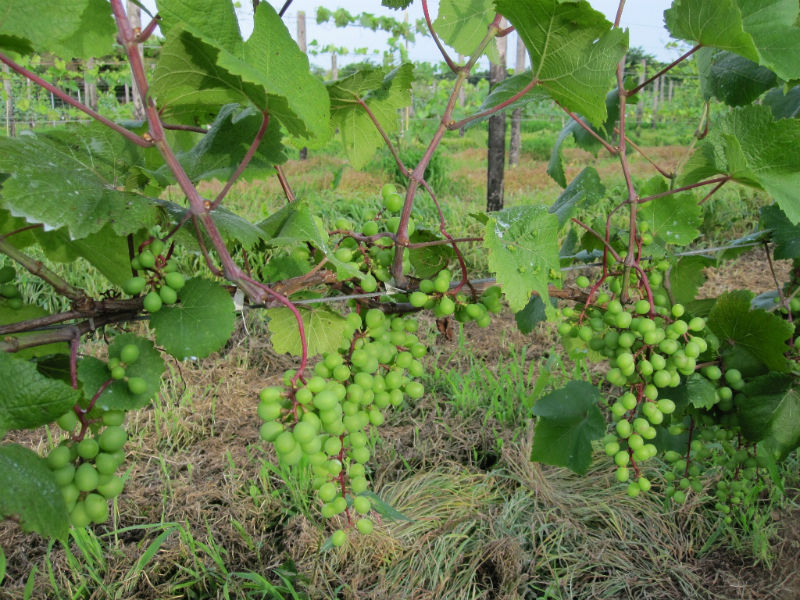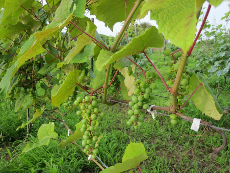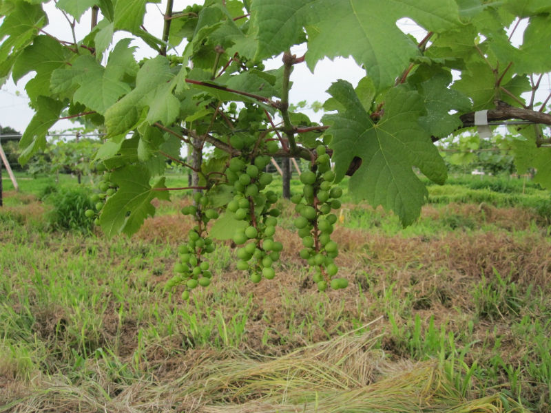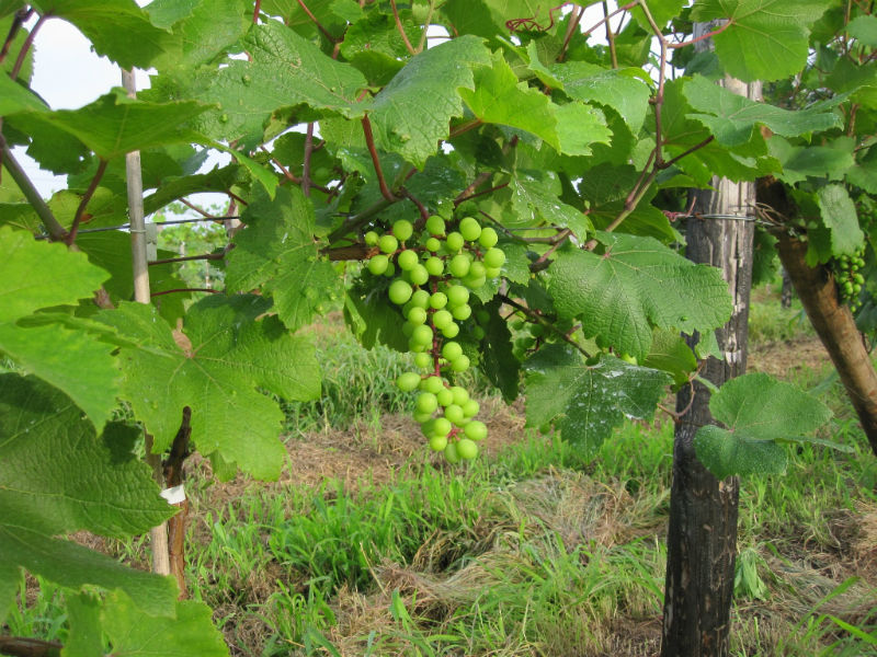 何十年もブドウ栽培を行っているプロの方からすると見当違いのチャレンジをしている気がしますが、1000年近くの栽培実績がある甲州は棚方式があっているように思います。高温多湿であっても、樹幹が広く新梢もゆとりある空間に存在し、かつ、朝晩には風が通り抜ける状況があれば国産・ヨーロッパ系統ともよく育ち良いブドウができるのではないかと考えています。大木仕立ての方法は、すみませんが知りません。今度勉強しておきます。今年はベト、黒とう病が多発しています。私のところも一部感染していますが、新梢・房の切除と圃場からの持ち出しを行い、停まっていると信じています。今後1~2週間が勝負と考えています。背負い動噴での消毒作業は結構きついものです。待ったなしの状態ですから余計です。