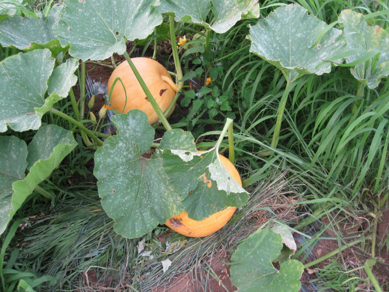 写真(9)は直径がすでに30cmにもなったアトランティックジャイアント(西洋かぼちゃ)で、ハローウィンで主に用いられているかぼちゃです。食用には向きませんが、どこまで大きくなるかを競う大会もあるようです。そろそろ追肥(化成肥料)をやらなければなりません。