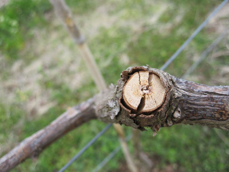 一方、写真(2)に示されるように剪定箇所における裂っかも確認できました。これは「甲州」ですが、やや太い枝の剪定箇所に認められる傾向があります。冬季の剪定も、切断面の保護が必要なことを生食用のプロの方が言っておられましたが、その必要性を今目にすることができました。剪定後も零下になることがあり、水分が残っていれば凍上による水分の体積膨張で枝が割けることを確認しました。