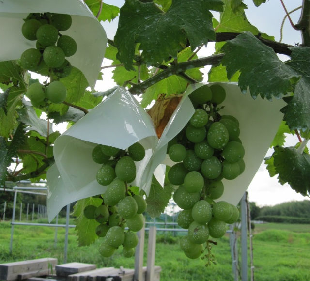 さて、16日から17日にかけて大雨が降りましたが、農場ではベト病などの病気の蔓延もなく、安定した状態が続いています。写真(1)は生食用の葡萄ですが挿し木をいただいた時点で品種を書いた紙を紛失してしまい、品種がわかりません。醸造用ブドウに比べ果粒が大きく、立派に感じます。雨よけの傘をかけていますが、窮屈そうですね。