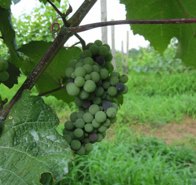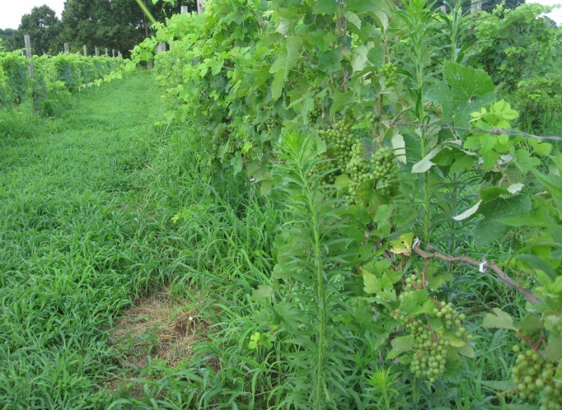 写真(4)は2年目の樹ですが、沢山の房を付け、枝も伸びすぎています。早く摘心(枝の先端を切ること)して葡萄粒に栄養が回るようにしてあげなければなりません。草も一雨で大きく成長しますので、草刈りもあります。農場では休む暇もないくらい、しなければならないことが山積みです。