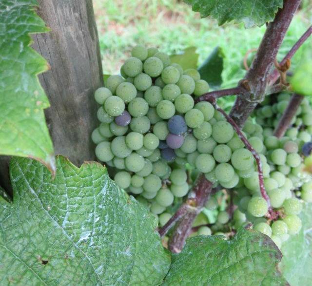 写真(2、3)は5年目の山ソービニオンですが、一部色づき始めています。5年目の樹は5本しかなく、遊び半分で植えてしまったものです。場所もここ栗原から離れたつくば市山口・清水坪というところでした。イノシシが畑を荒らしまわるような場所で、土壌もかなり粘土分が多く、水はけの悪い土地でしたが、ココへ移植してからはずいぶん成長が良くなりました。