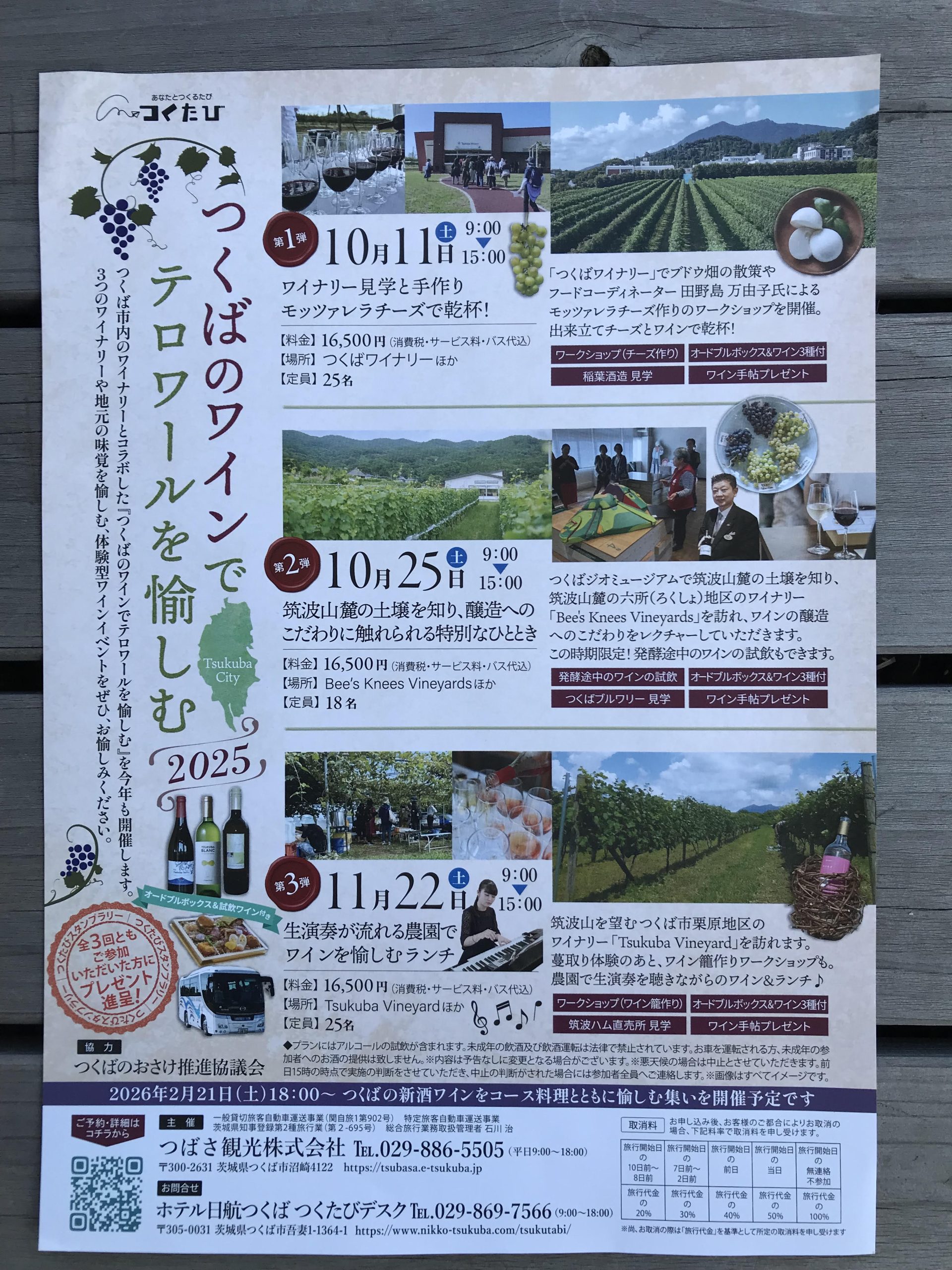 ホテル日航つくばたびデスクが主催する上記タイトルのイベントが開催されます。日程は11月22日の午前9時から。バスにて当Tsukuba Vineyardを訪れ、ブドウ枝を剪定してワイン籠作りのワークショップも開催されます。また、ピアニスト・神立響子さんによるエレクトーンの生演奏もあります。日航ホテル自慢のオードブルボックスとTsukuba Vineyardの2023栗原の白布(プティマンサンの瓶内2次発酵スパークリングワイン)、2024白、そして2024小公子もグラスにてサーブされます。贅沢なランチタイムをお楽しみください。まもなく定員に達しますので、お早目のご予約をおすすめいたします。