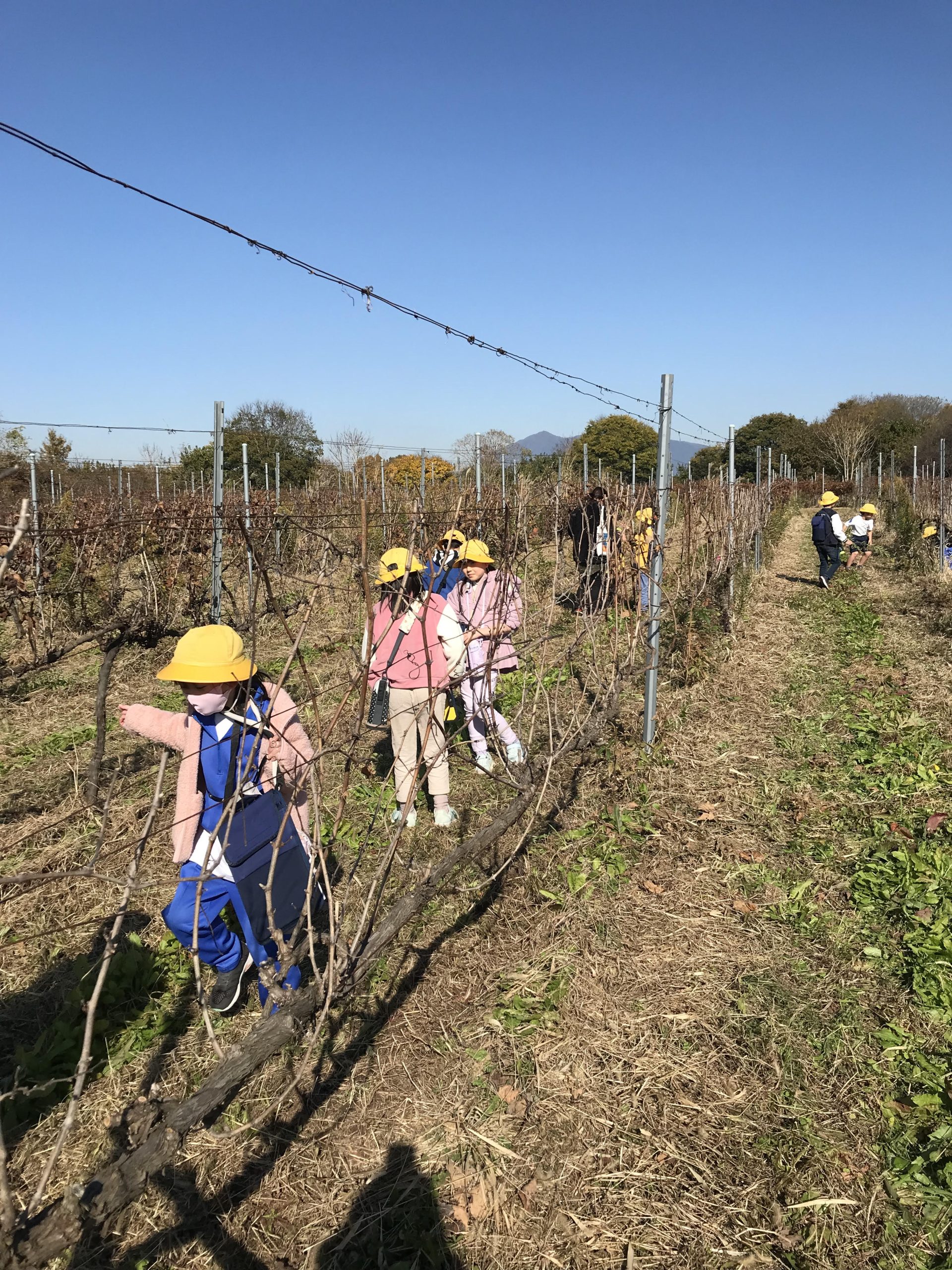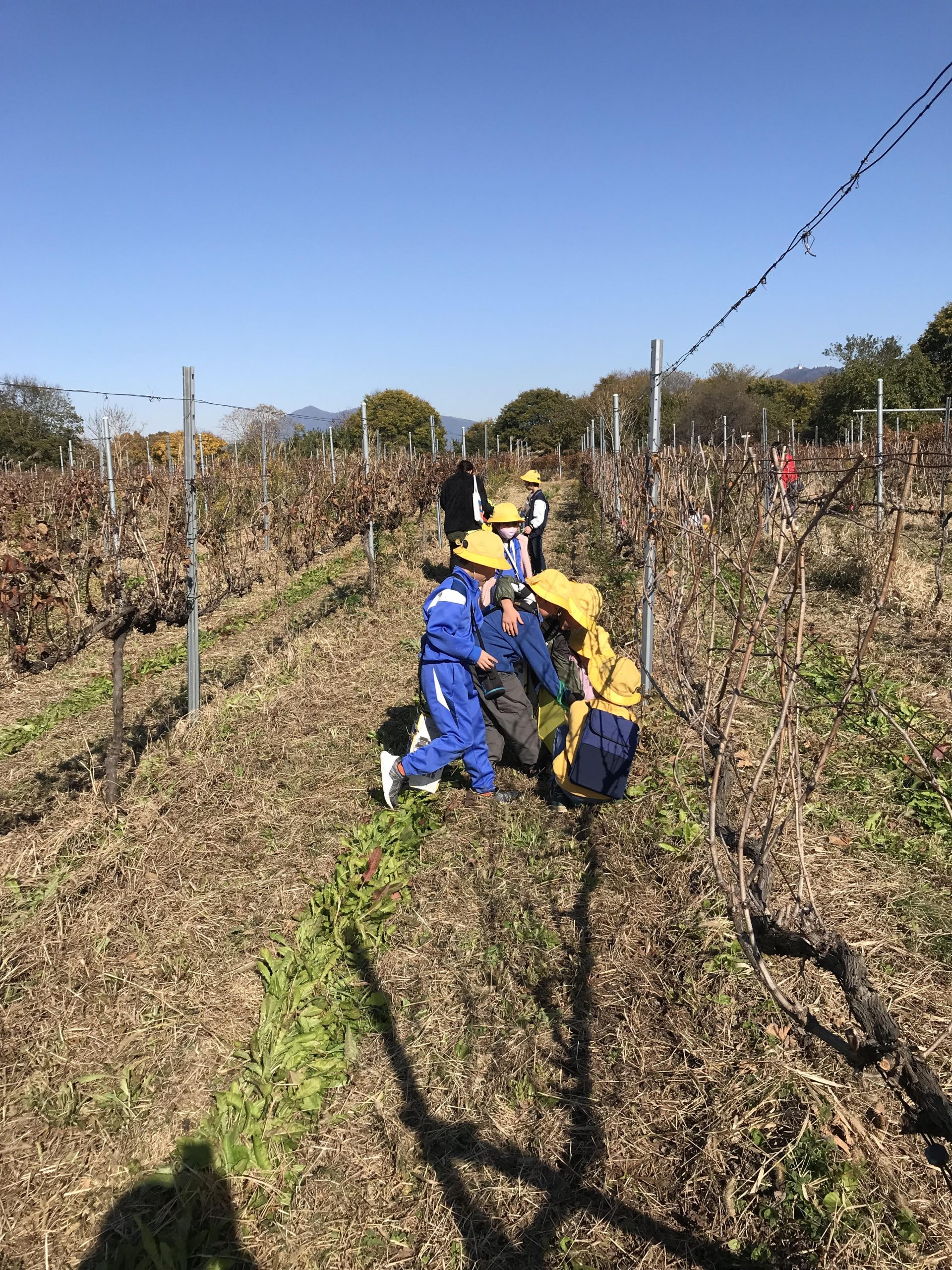 秋晴れの雲一つない晴天のもと、栗原小学校2年生の農場見学がありました。先生の引率のもと、小学校から徒歩にて農場まで来てくれました。先生と打ち合わせをする中で、ワイナリーの中は作業工程からも人数からも見学は難しいとの判断に至り、農場中心にすることになりました。年間の作業を通して草刈りは時間からも内容からも重要な作業なので、草刈りに使用する道具類を見てもらい、使い方や違いについて説明することにしました。手で持って作業する小さな手鎌をはじめ、草刈り鎌(立ち鎌)など5種類、そしてより広い面積の草刈りに用いる動力の付いた機械類、5種類を見てもらいました。草丈や面積に応じて機械を使い分けることなどを説明しました。