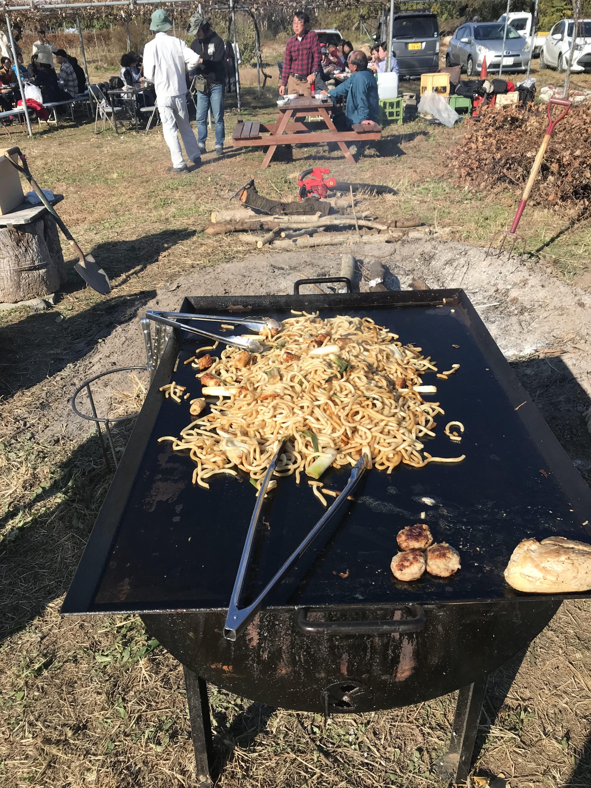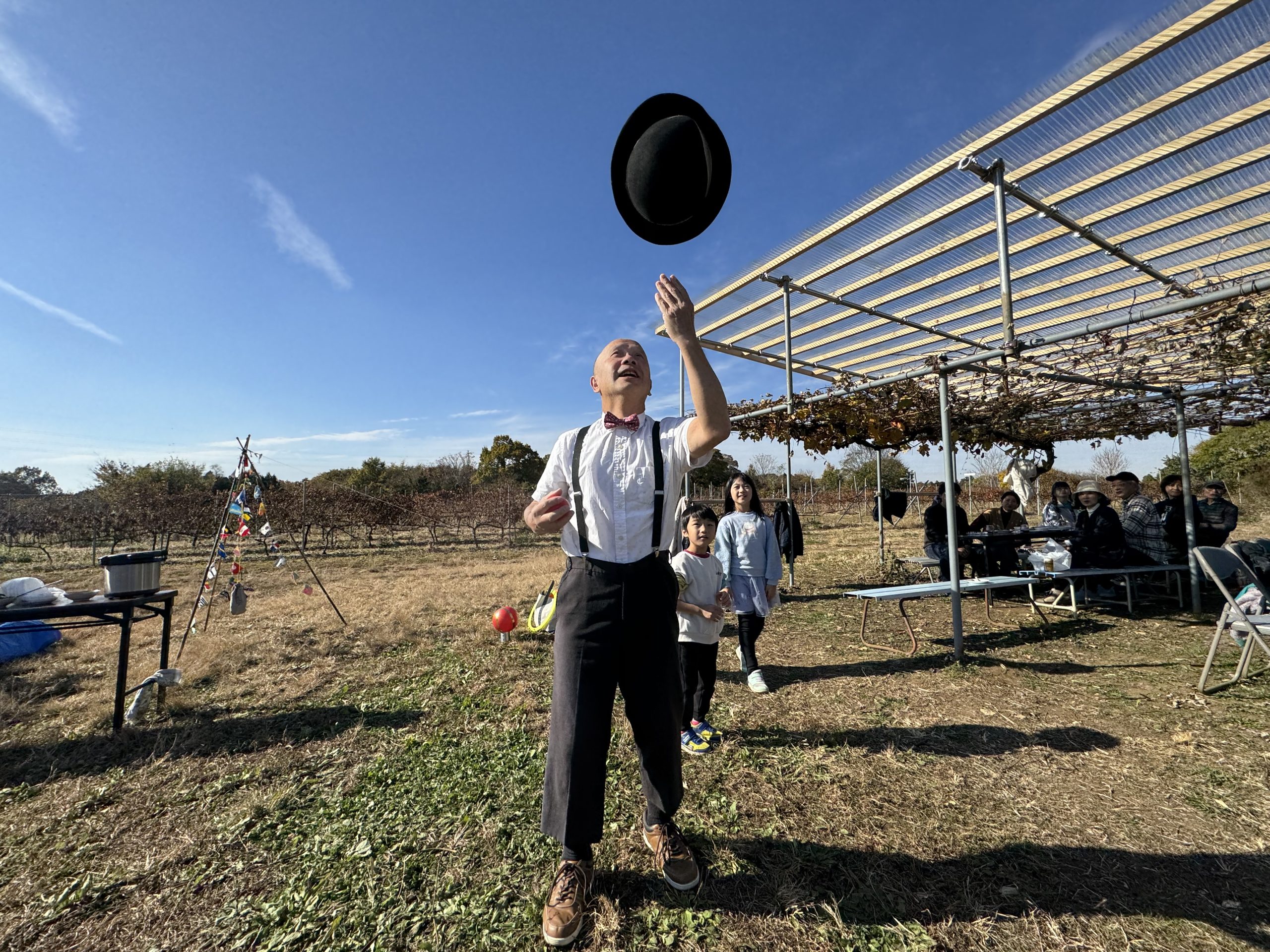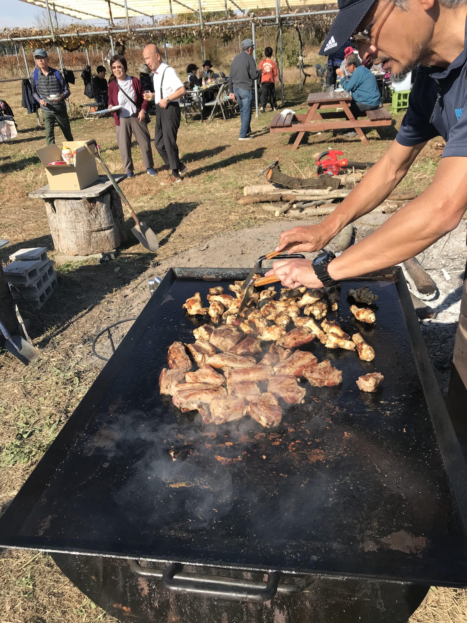 前日の小雨状態が続いていたらどうしようかと悩んでいましたが、そんな心配は無用の快晴の空でした。8時ごろから準備を始め、12時過ぎに2025白ワインで乾杯してスタートしました。総勢40名を超える参加者で、特に隊長はじめ子供たちが良くお手伝いをしてくれました。受け付けや会費の徴収、角打ちの釣銭までしっかりと対応できていました。ジャグラー岡田さんの登場で、子供たちが岡田さんに近寄りすぎて会場は笑いが絶えなく響きました。今回もともちゃんの3種類のパンやケーキ、キノコたっぷりのアヒージョ、大根と豚バラ肉のスープなどワインに合う品が用意されていました。また、中野さんの定番、鉄板焼きのお肉、そして焼うどんも大好評でした。その傍らで豚肉(三元豚バラ肉、ハラミ、カシラ)、味付けラム肉、スルメイカの丸焼きなども準備され、完食の状態でした。ワインは2025年の新酒を4種類準備して角打ちで楽しんでもらいました。感謝祭にふさわしい、おいしくしかも楽しい時間を過ごすことができました。12月は山形風の芋煮会を予定しています。