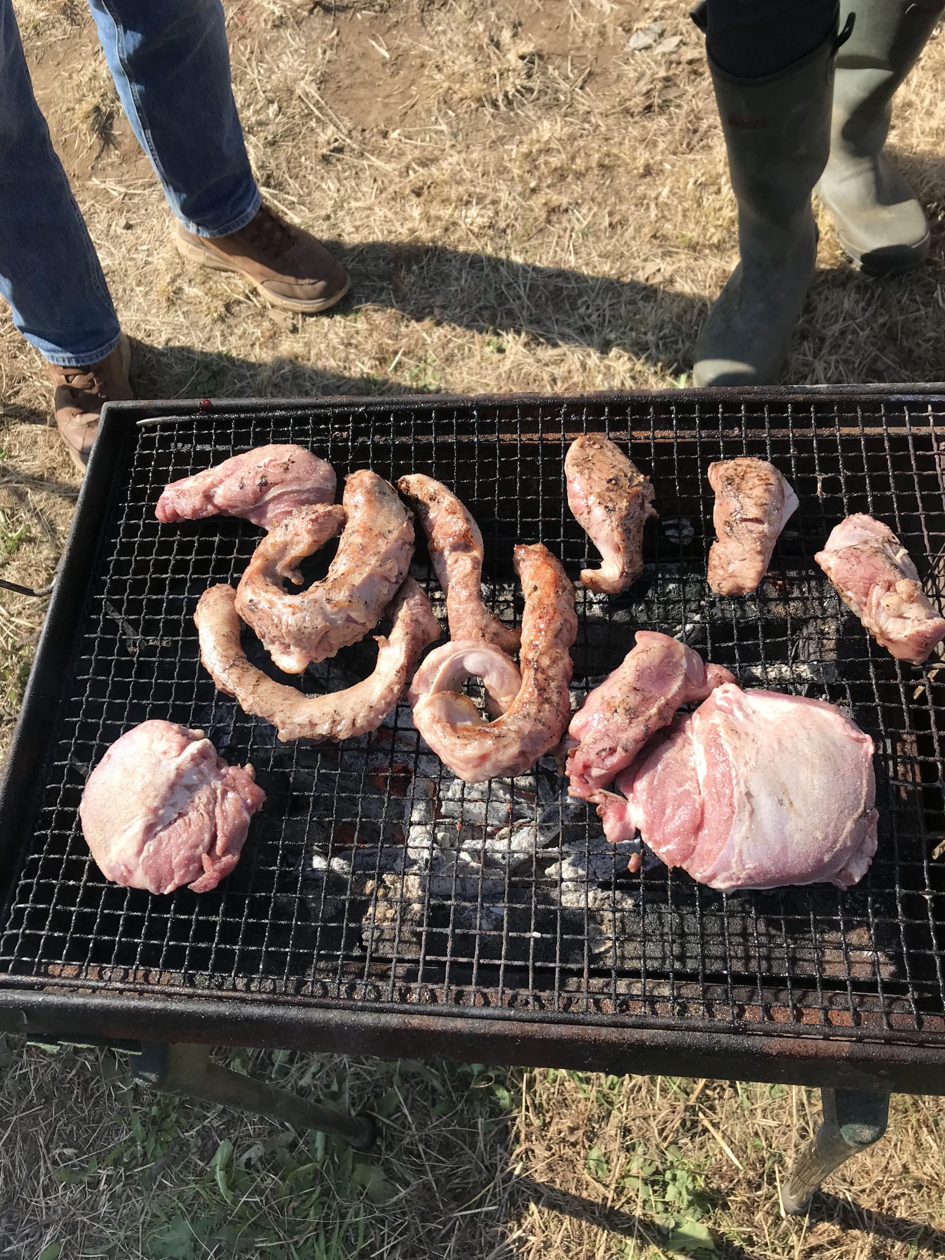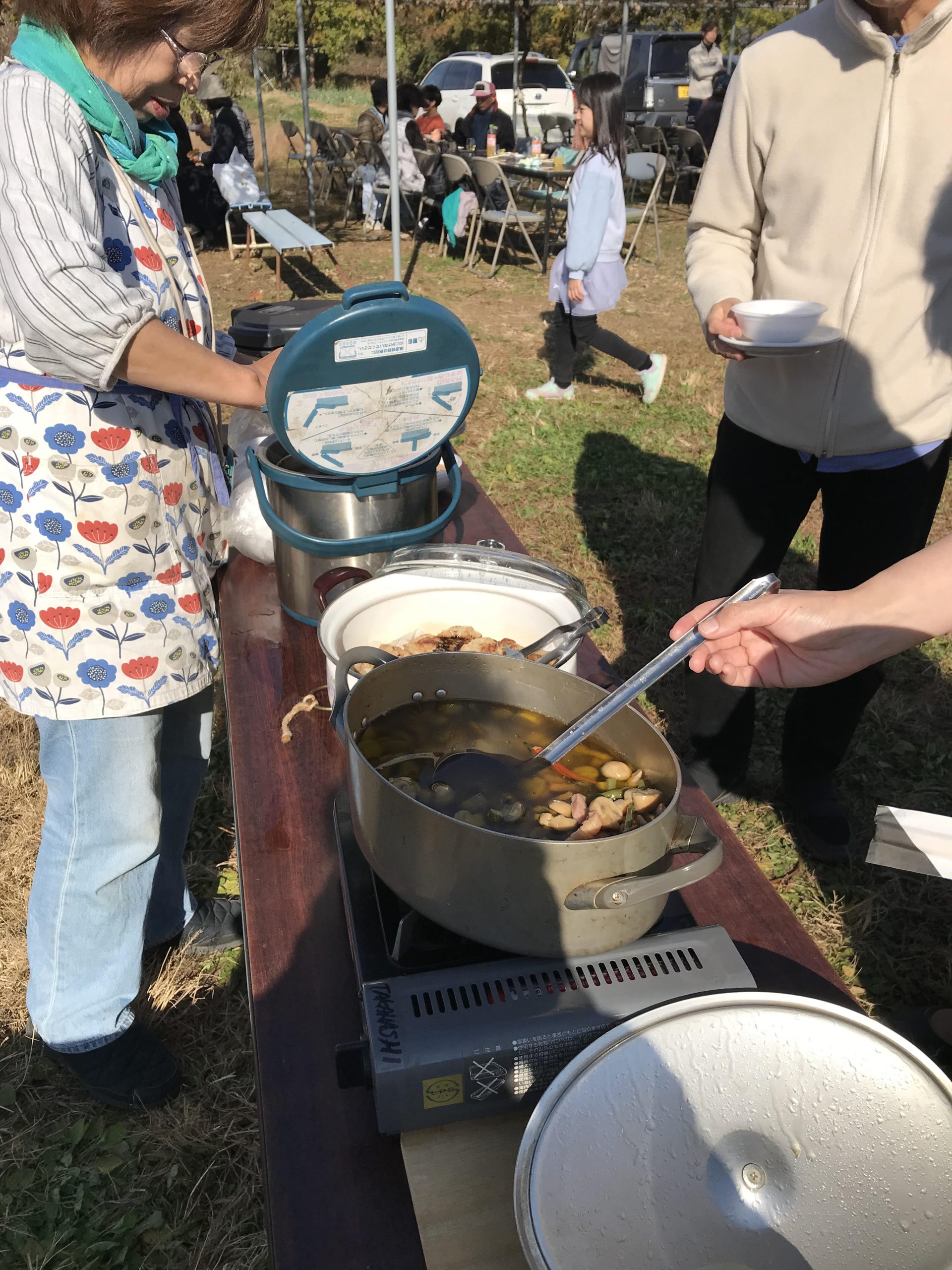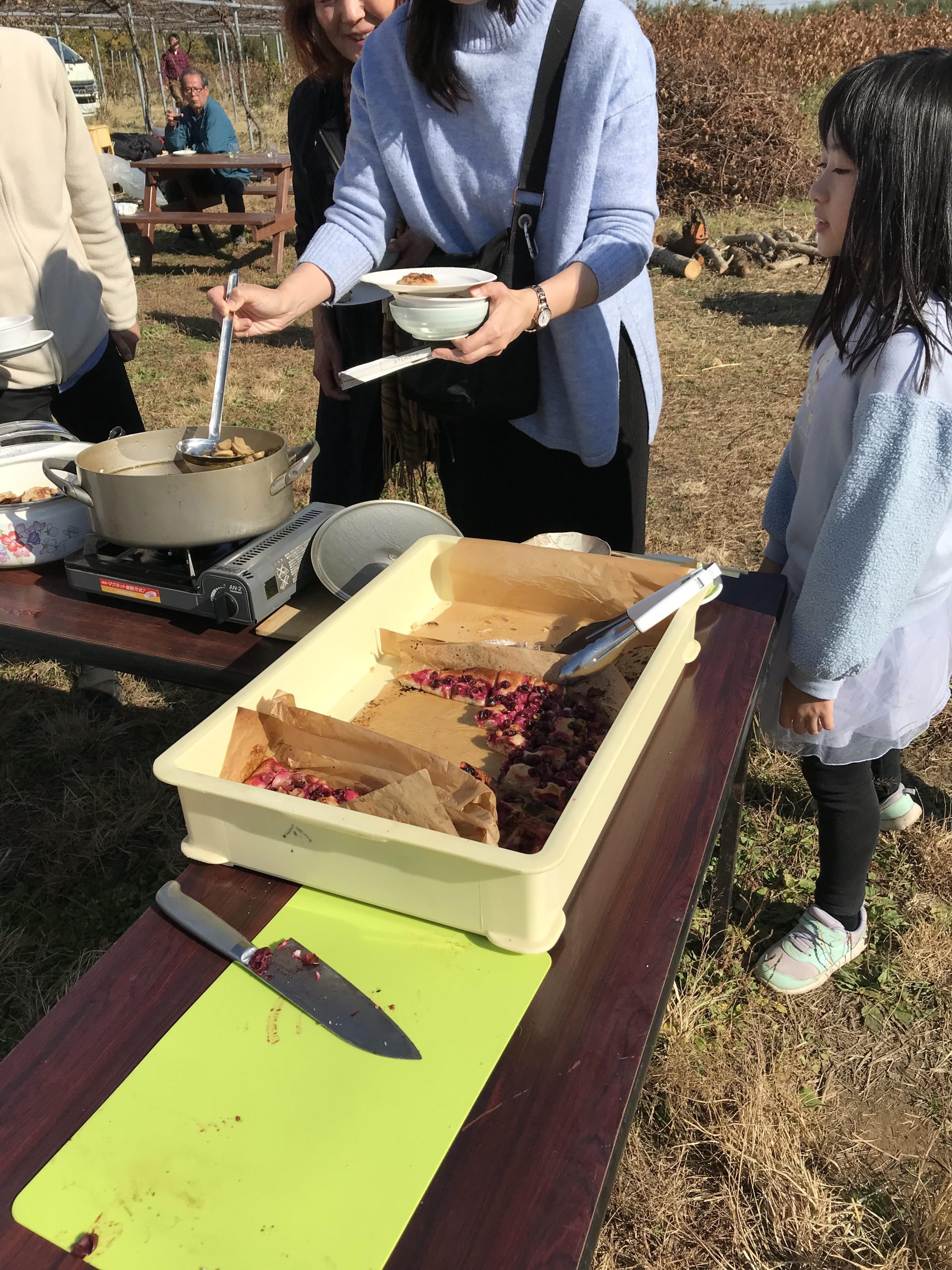 前日の小雨状態が続いていたらどうしようかと悩んでいましたが、そんな心配は無用の快晴の空でした。8時ごろから準備を始め、12時過ぎに2025白ワインで乾杯してスタートしました。総勢40名を超える参加者で、特に隊長はじめ子供たちが良くお手伝いをしてくれました。受け付けや会費の徴収、角打ちの釣銭までしっかりと対応できていました。ジャグラー岡田さんの登場で、子供たちが岡田さんに近寄りすぎて会場は笑いが絶えなく響きました。今回もともちゃんの3種類のパンやケーキ、キノコたっぷりのアヒージョ、大根と豚バラ肉のスープなどワインに合う品が用意されていました。また、中野さんの定番、鉄板焼きのお肉、そして焼うどんも大好評でした。その傍らで豚肉(三元豚バラ肉、ハラミ、カシラ)、味付けラム肉、スルメイカの丸焼きなども準備され、完食の状態でした。ワインは2025年の新酒を4種類準備して角打ちで楽しんでもらいました。感謝祭にふさわしい、おいしくしかも楽しい時間を過ごすことができました。12月は山形風の芋煮会を予定しています。