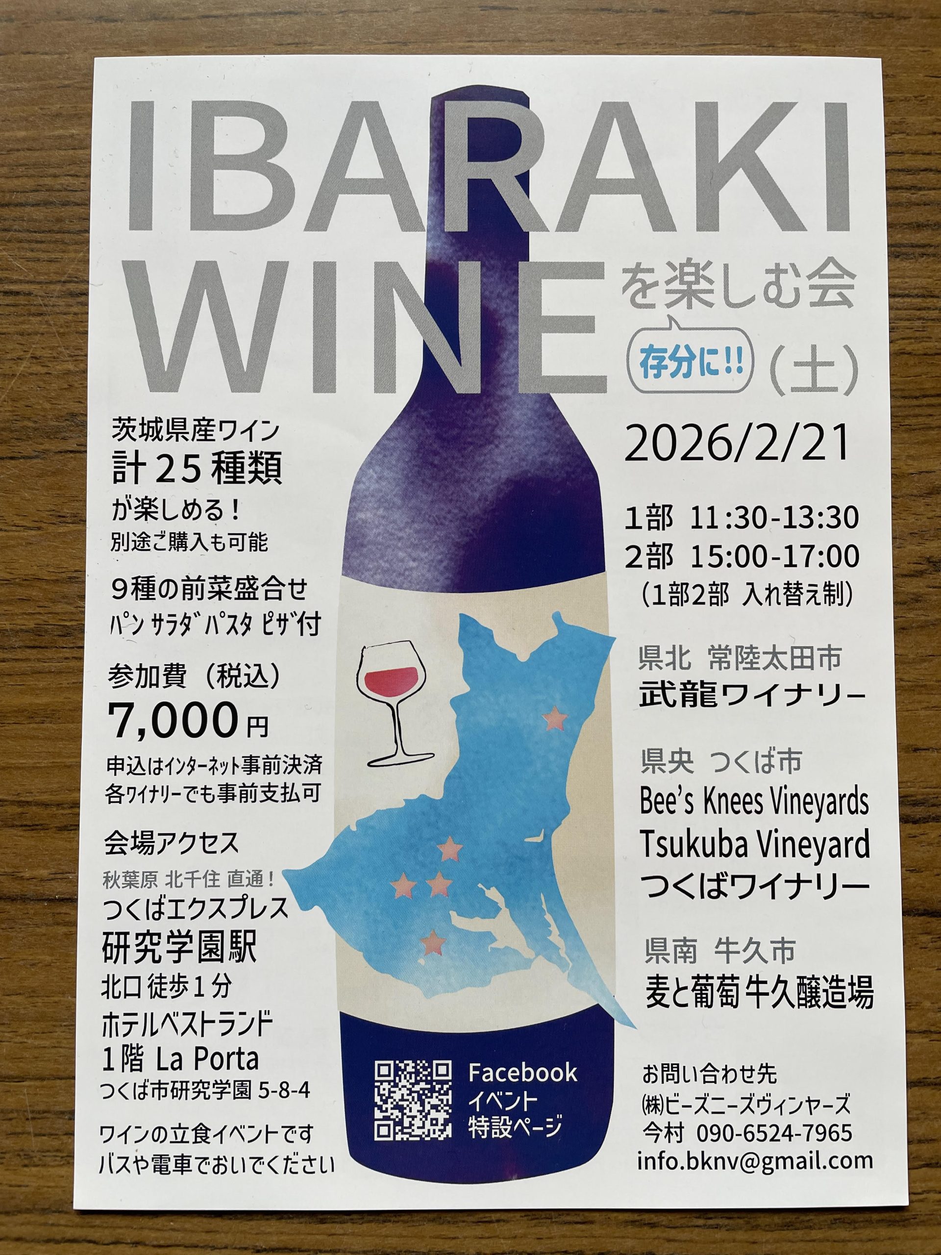28 1月 2月21日IBARAKI ワインを楽しむ会開催案内! Tweet 昨年に引き続き、第2回目の開催となります。県内5ワイナリーが、それぞれ選りすぐりのワイン5種類、合計25種類のワインが飲めるという貴重な機会となります。30㏄づつのサーブですので、すべて飲むと750㏄とボトル1本に相当します。9種類の前菜のほか、パンやパスタ、ピザもついています。大変お得なワイン会ですので、ぜひご検討ください。1部と2部の開催となり、ネット事前決済のみとなっています。QRコードからお申し込みください。 投稿者: 高橋 学